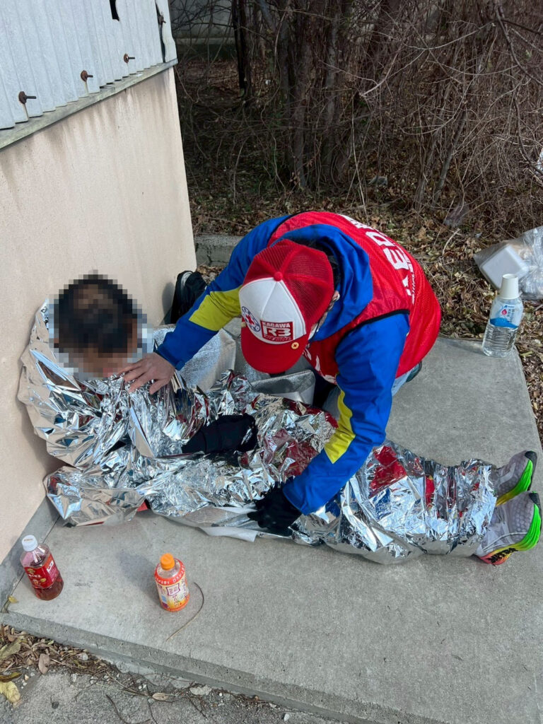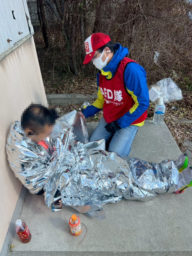 寒い中、皆さん頑張られていましたが、中には体調を崩される方もいらっしゃいました。救護時、体を保温するためにエマージェンシーブランケットを使用し、対応いたしました。